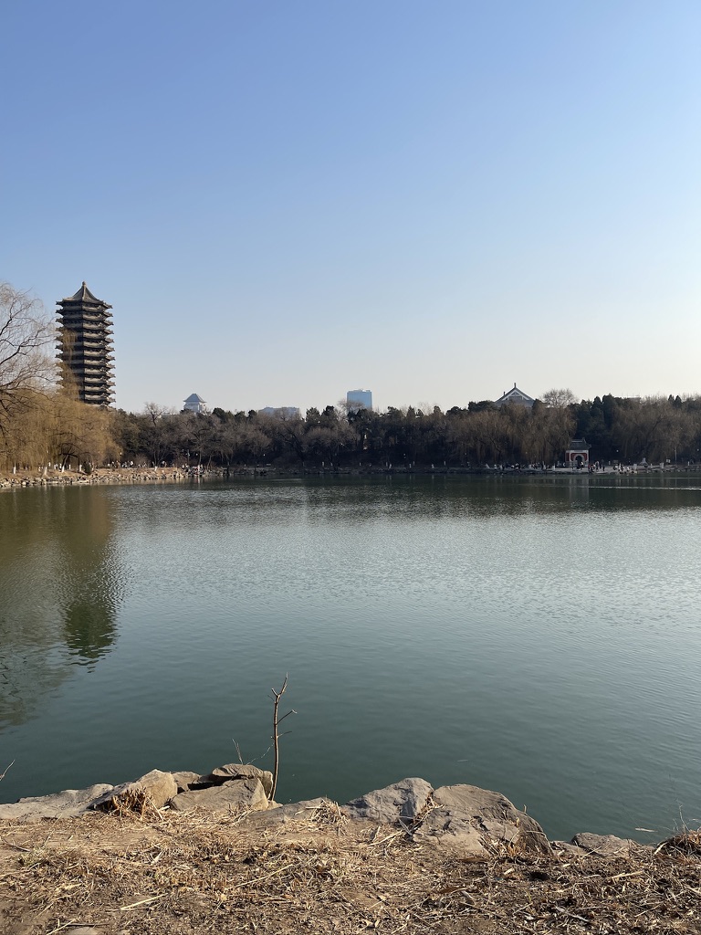 ↑北京大学のランドマークである未名湖。冬は凍った湖面でスケートができるみたいです。