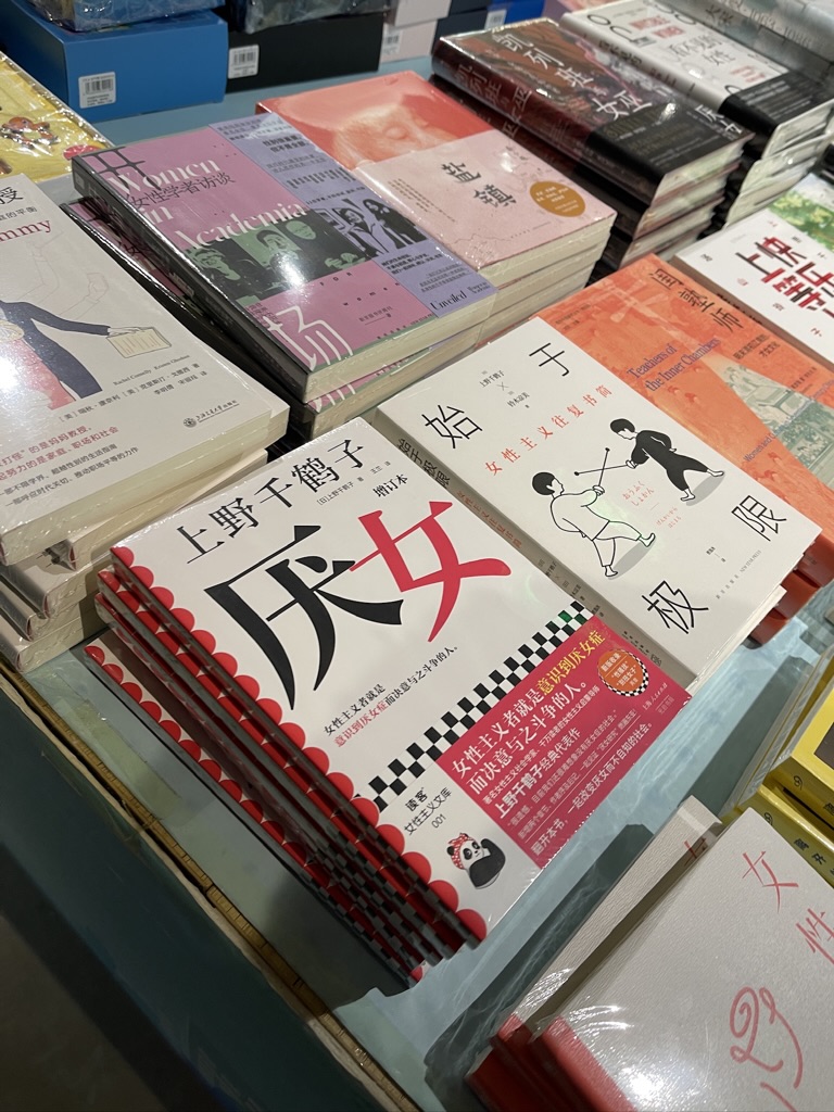 ↑書店に並べてあった、上野千鶴子さんの書籍。東大入学式でのスピーチがきっかけで、現在中国でブームになっているそうです。