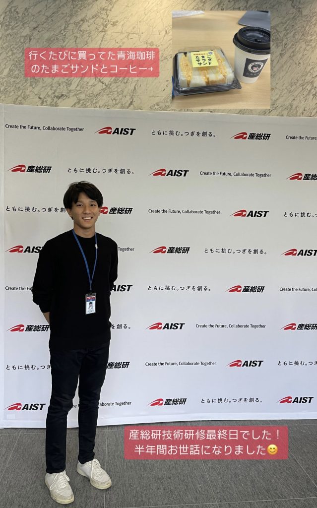 産総研の技術研修を通じて、技術的・学術的な学びがあったのはもちろんのこと、研究や研究者としてのキャリアに対する解像度が上がりました。また、技術研修のような短期間の研究で得られるものもある一方で、自身のテーマに時間をかけて深く掘り下げることの重要性も痛感しました。産総研での技術研修はこれで一区切りとし、卒論・修論を通じて研究する有機デバイスのテーマに今後は集中しようと思います。